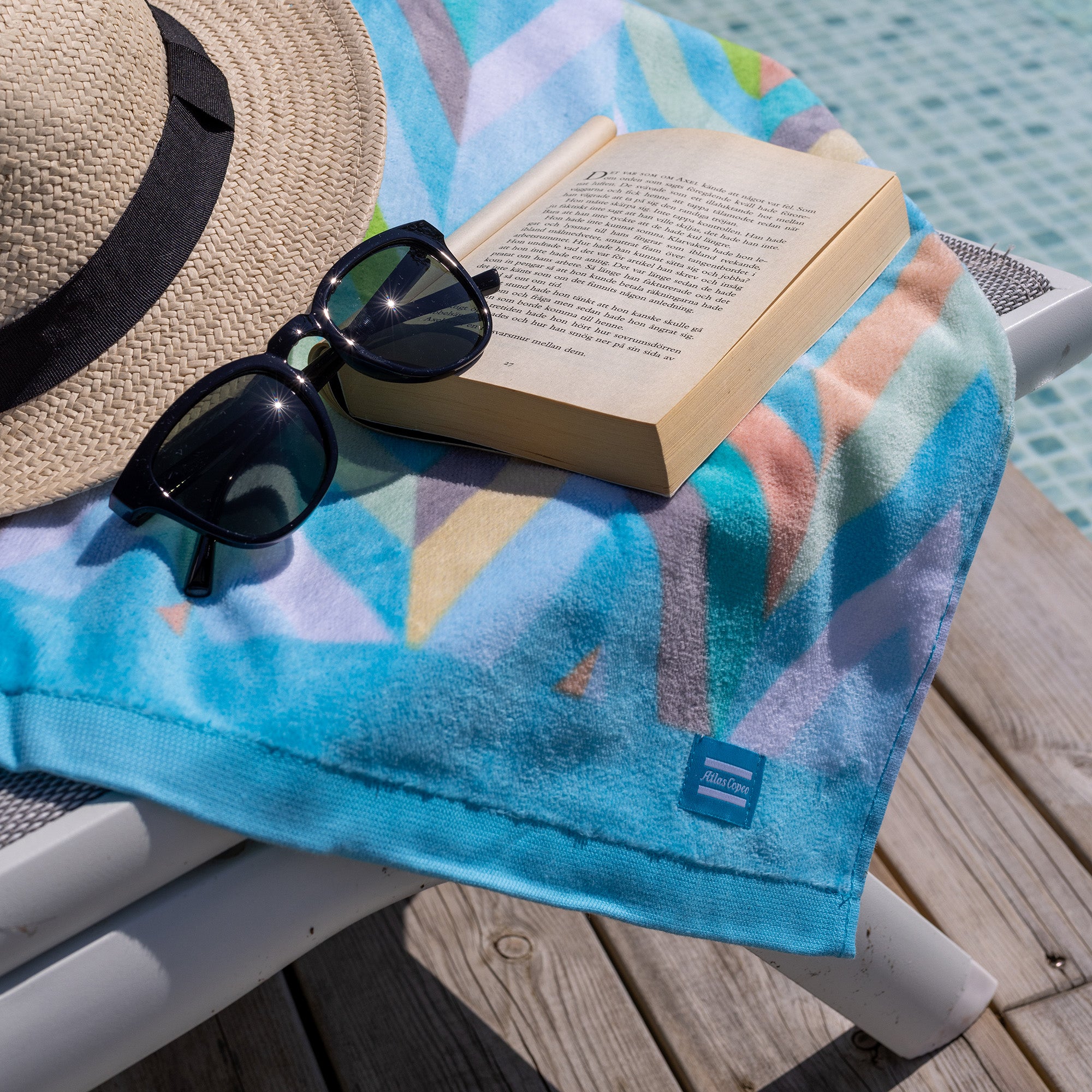 • multi color beach towel with blue atlas copco logo