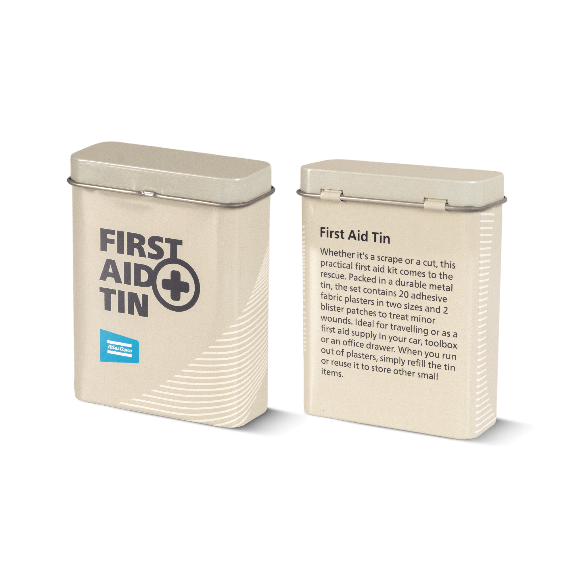 Whether it's a scrape or a cut, this practical first aid kit comes to the rescue. Packed in a durable metal tin, the set contains 20 adhesive fabric plasters in two sizes and 2 blister patches to treat minor wounds. Ideal for travelling or as a first aid supply in your car, toolbox or an office drawer. When you run out of plasters, simply refill the tin or reuse it to store other small items.